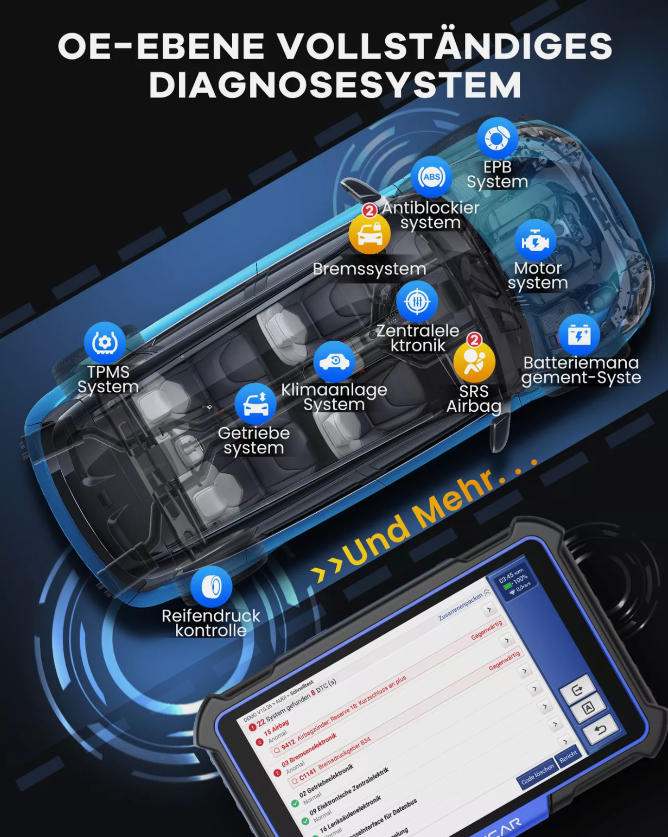 · Vollständige Systemdiagnose auf OE-Niveau: Lesen von Fehlercodes für alle Systeme, wie z. B. ECM, TCM, ABS, SRS, BCM, IMM, BMS, TPMS, SAS, Kraftstoffsystem, Lichtsystem, Wischersystem